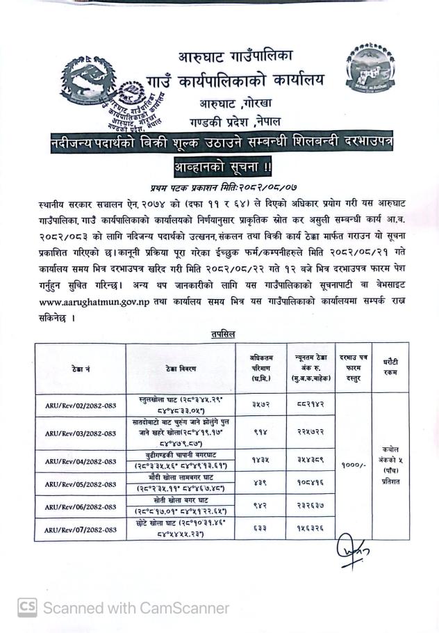 » नदीजन्य पदार्थको बिक्री शूल्क उठाउने सम्बन्धी शिलबन्दी दरभाउपत्र आव्हानको सूचना !!