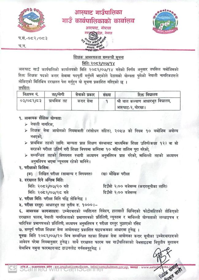 शिक्षक आवश्यकता सम्बन्धी सूचना !!