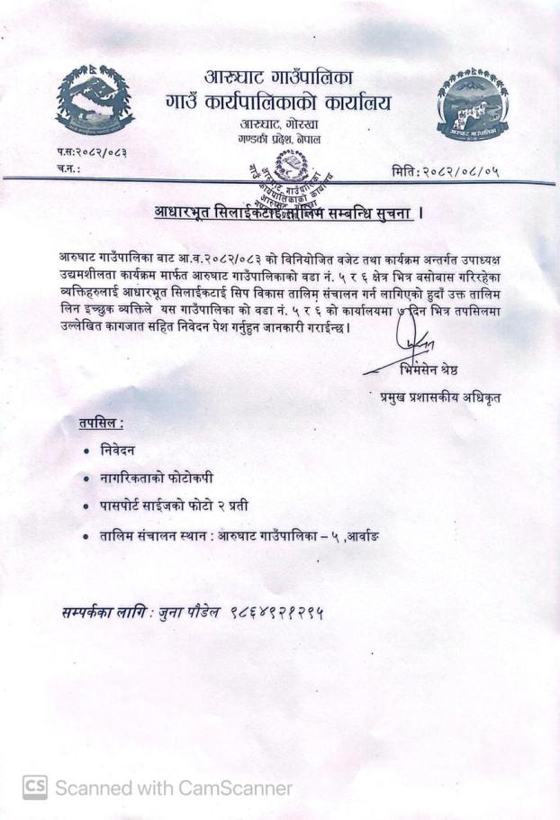 आधारभूत सिलाईकटाई तालिम सम्बन्धि सुचना ।