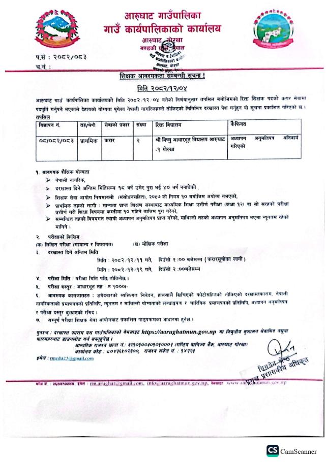 शिक्षक आवश्यकता सम्बन्धी सुचना !