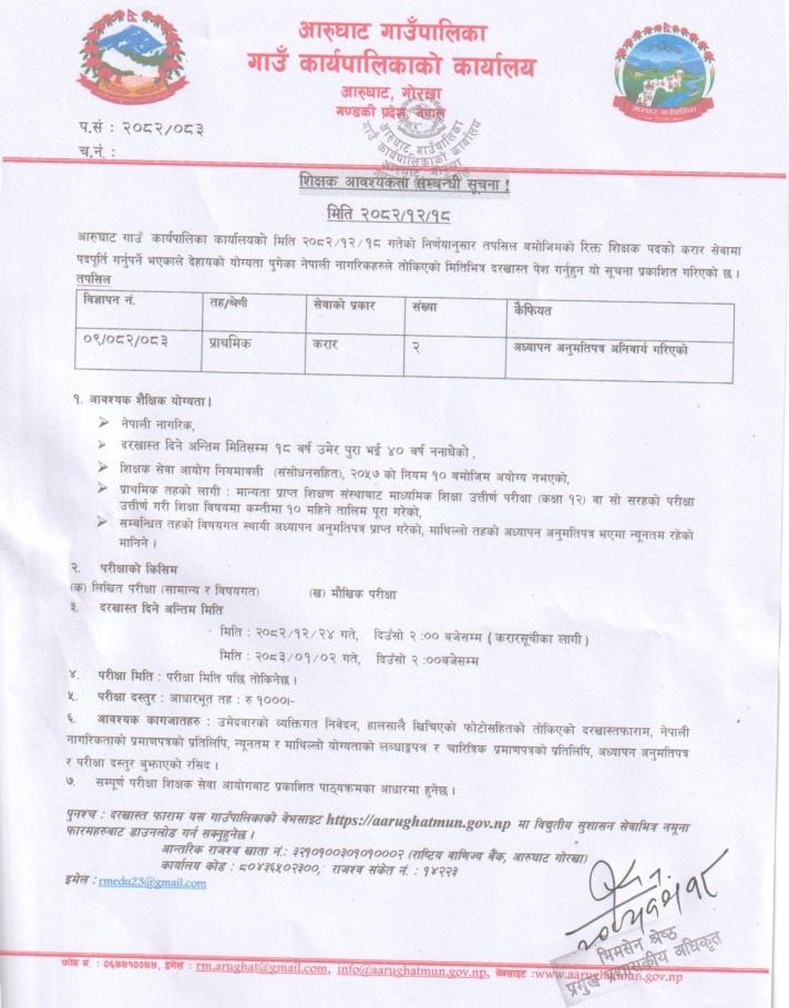शिक्षक आवश्यकता सम्बन्धी सुचना !