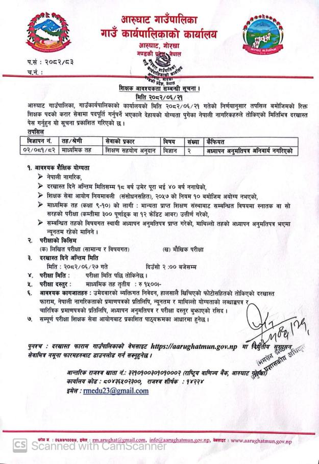शिक्षक आवश्यकता सम्बन्धी सूचना ।